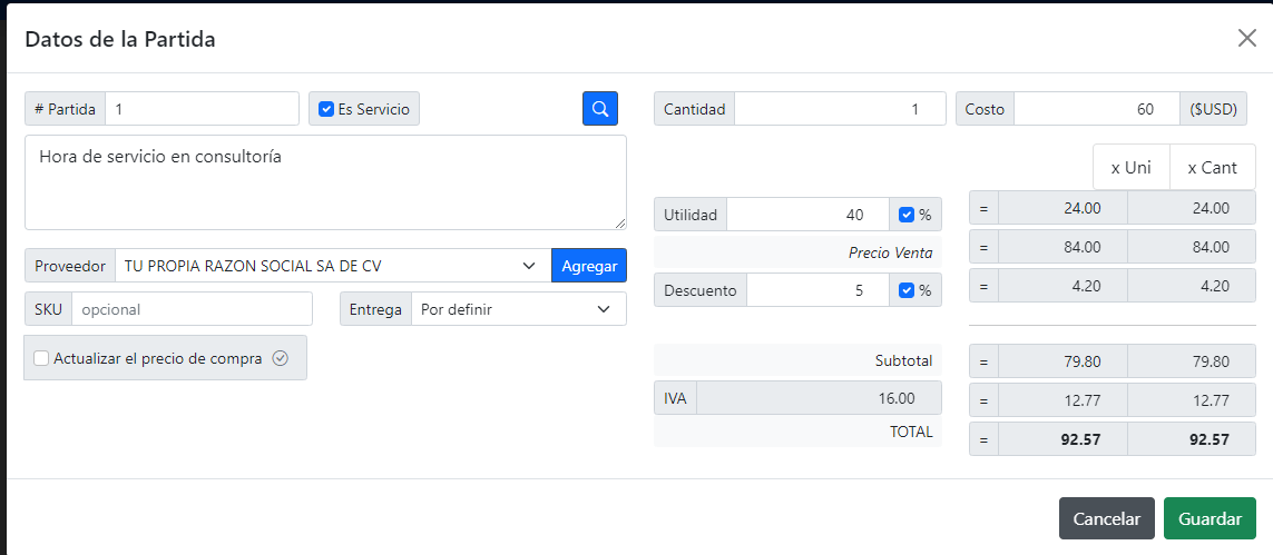 Capturas el costo de tu producto o servicio y la ganancia deseada ya sea por porcentaje o cifra monetaria específica, de esta manera siempre sabes cuánto cuesta y cuanto ganas al cotizar, también relacionamos el producto o servicio con el proveedor que te lo vende para su seguimiento.